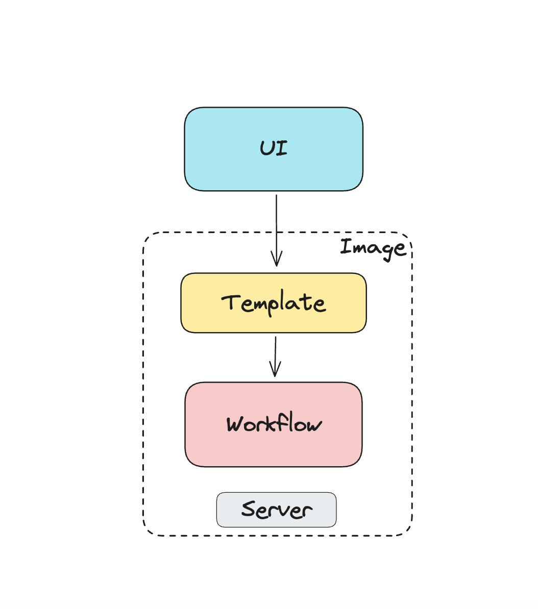 When a user creates a workflow, under the hood a Docker image is created. The image contains the template and the workflow module, interfaced via a FastAPI server. This server is the entry point for all user interaction with the live workflow.